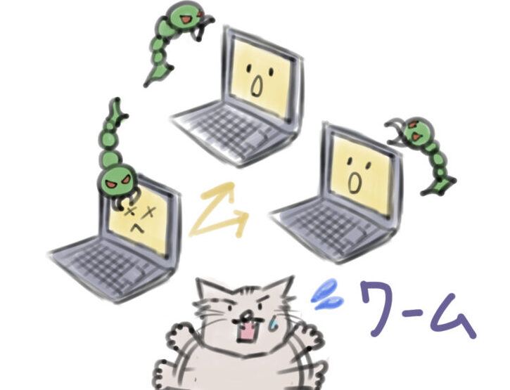 ワームとは~30秒で解説~ ・自分自身をコピーしてネットワーク上に自動で拡散するマルウェアの一種 ・ウ…